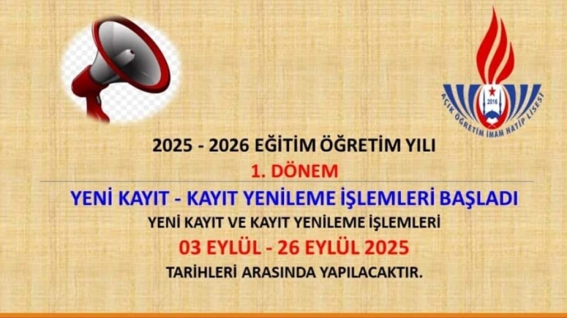 Açık Öğretim İmam Hatip Lisesi 2025-2026 eğitim öğretim yılı 1. dönem yeni kayıt ve kayıt yenileme işlemleri başlamıştır.